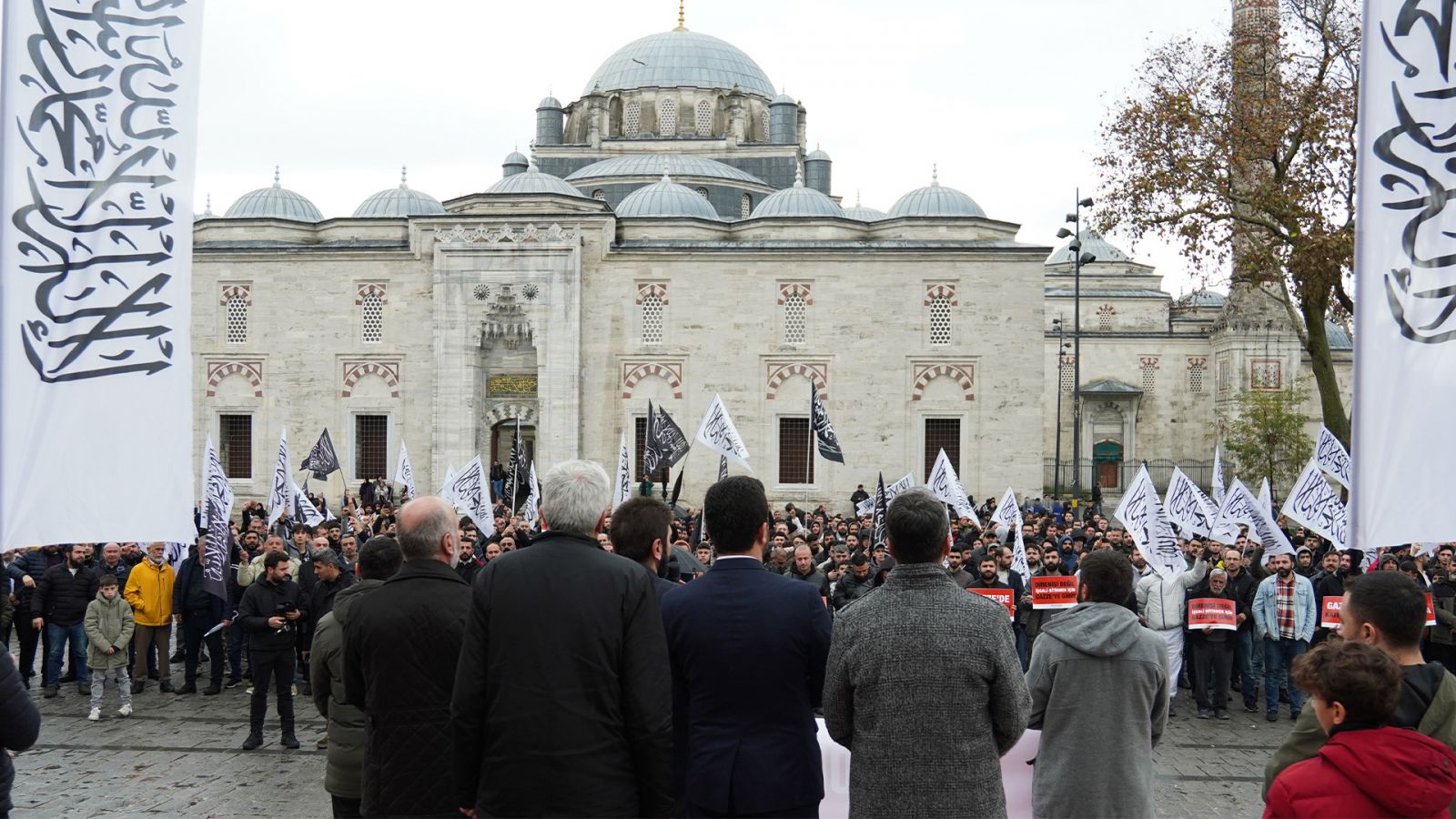 İstanbul’da Beyazıt Meydanı’nda yoğun bir katılımla gerçekleşen basın açıklamasını Hizb-ut Tahrir Türkiye Medya Bürosu Üyesi Muhammed Emin Yıldırım okudu.